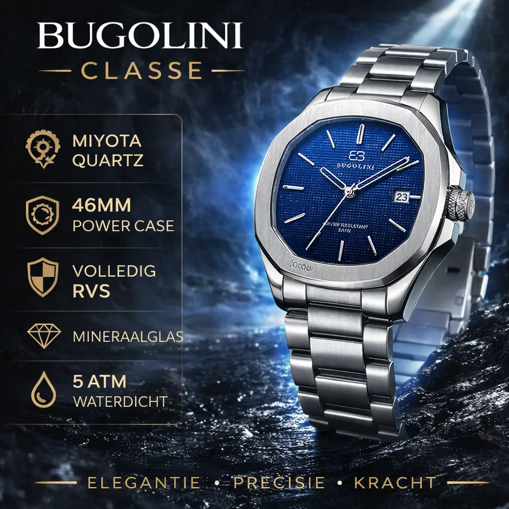 Met een waterdichtheid van 5 ATM is dit horloge bestand tegen spatten, regen en handen wassen. Of u nu onderweg bent, op kantoor of een weekendactiviteit plant – de BUGOLINI Classe is er altijd.