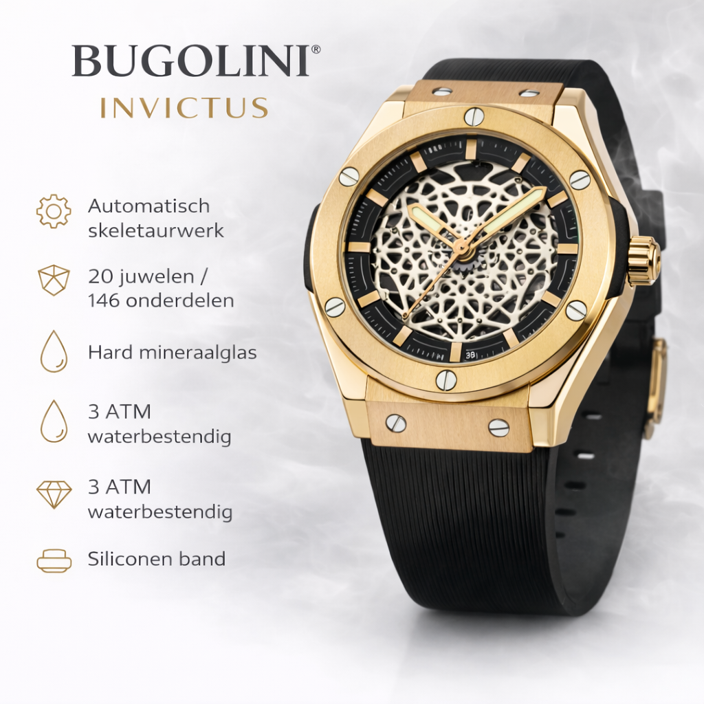 Take your look to the next level with the BUGOLINI® INVICTUS, a mechanical masterpiece that effortlessly combines tradition and innovation. This exceptional timepiece features a 20-jewel automatic skeleton movement with 146 moving parts, which together ensure refined and precise timekeeping. Every movement of your wrist brings the watch to life – fully automatic, without batteries.